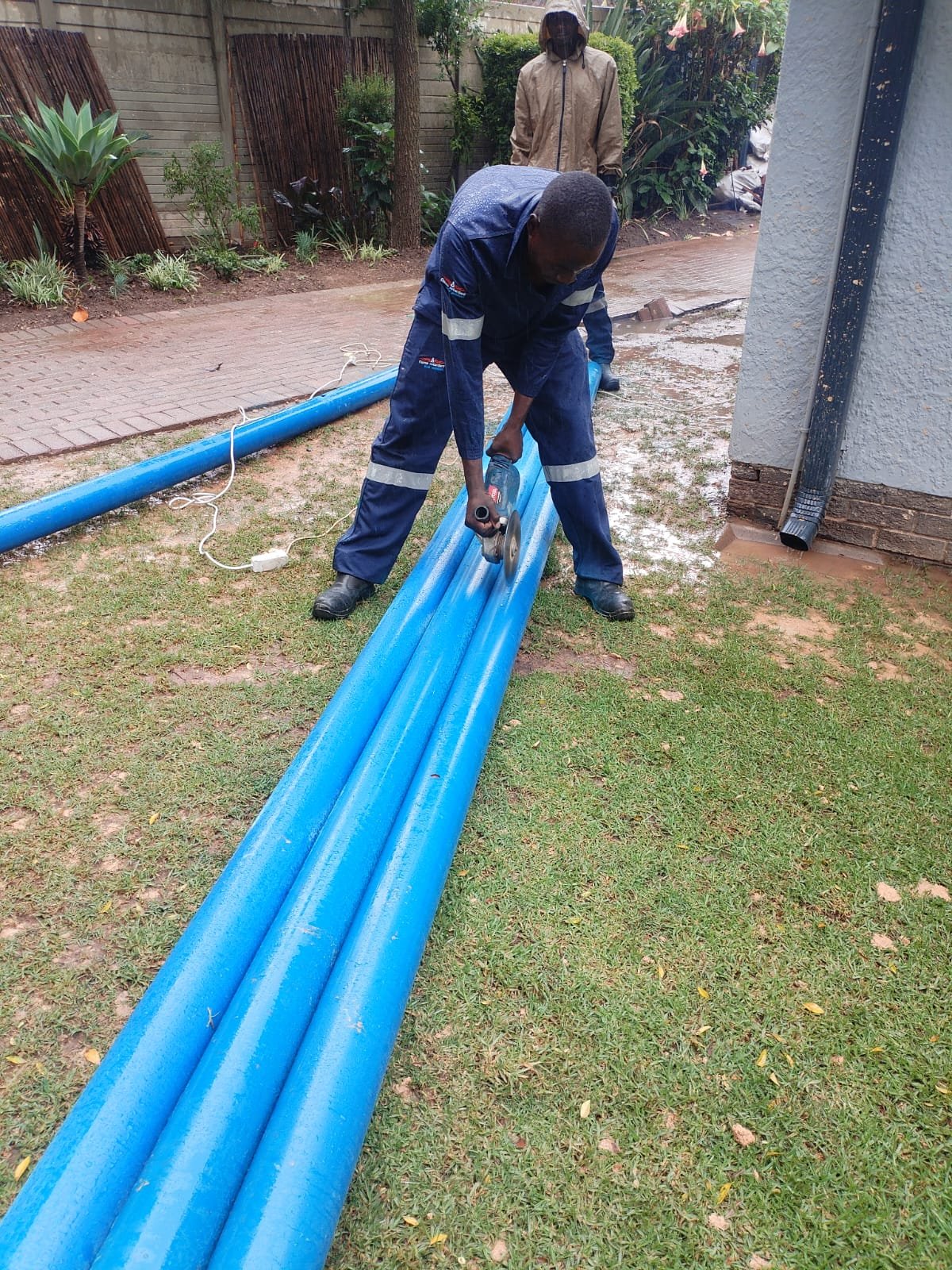 Professional Drilling & Casing Our drilling team arrives with our heavy-duty rig and drills to the required depth. We then install high-quality, solid blue borehole casing (as seen being cut by our team) to ensure the borehole's structural integrity and prevent collapse.