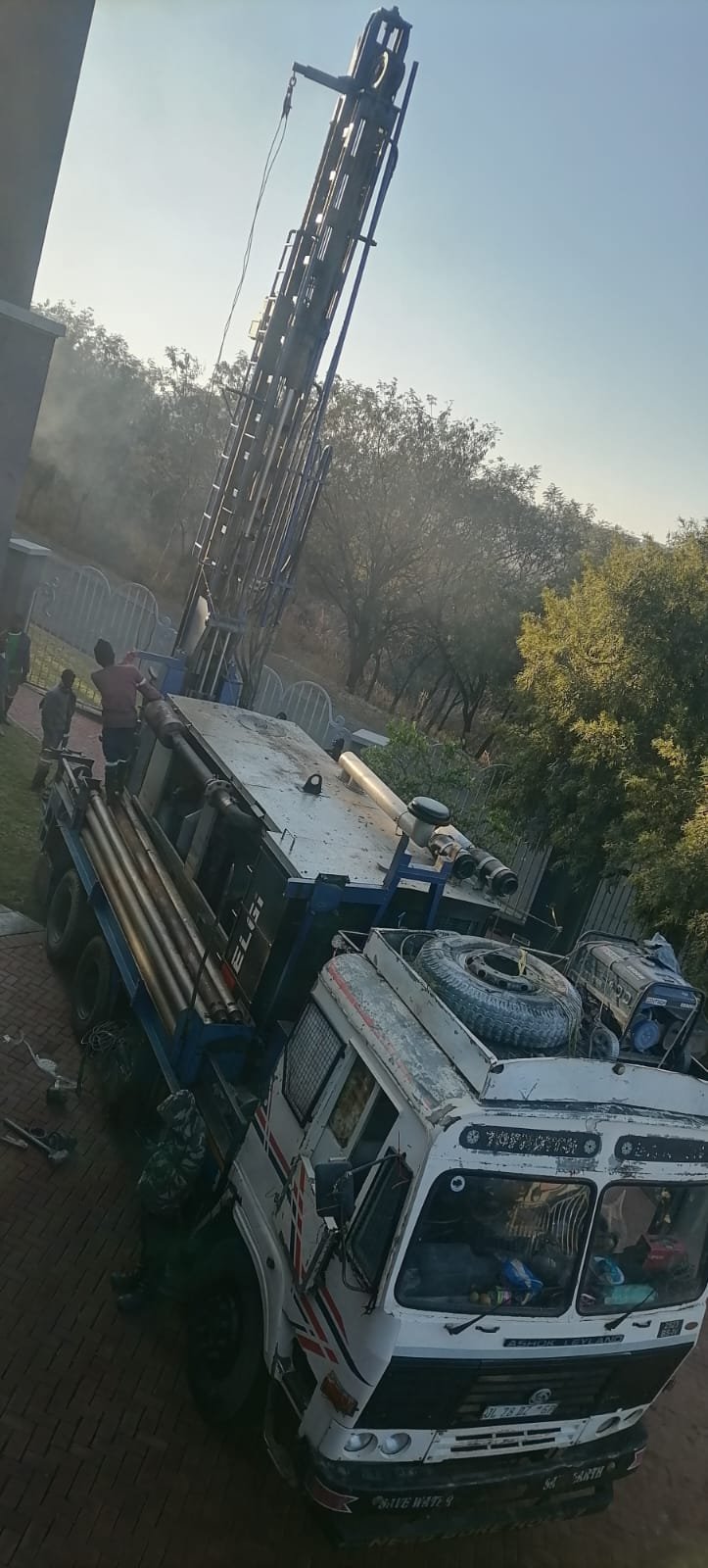 Professional Drilling & Casing Our drilling team arrives with our heavy-duty rig and drills to the required depth. We then install high-quality, solid blue borehole casing (as seen being cut by our team) to ensure the borehole's structural integrity and prevent collapse.